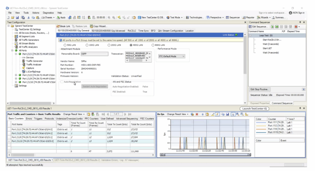 To achieve this, four Spirent ports were directly connected to the QFX5240, forwarding both RoCEv2 and the brand-new UET-style AI workloads concurrently. This mirrored a realistic deployment scenario where next-gen and existing legacy traffic types must coexist without interference or compromising performance or reliability.